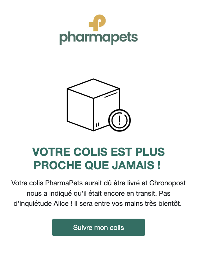 Avec des emails de livraison affichant un taux d’ouverture près de deux fois supérieur à la moyenne du secteur (57 % vs 31 %), PharmaPets a vu l’opportunité de transformer un moment fonctionnel en canal d’engagement puissant.