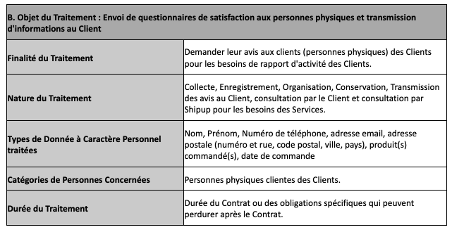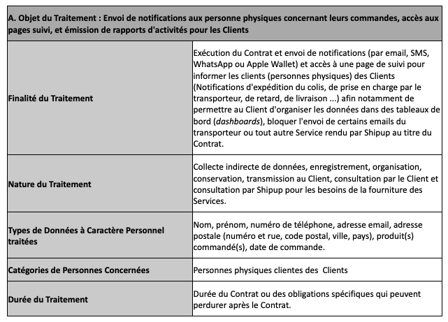 The purpose of this appendix is to define the conditions under which Shipup undertakes, in its capacity as a Subcontractor, to perform on behalf of the Customer the Personal Data processing operations defined below in accordance with its instructions as set out herein and as part of the provision of the Application Service.