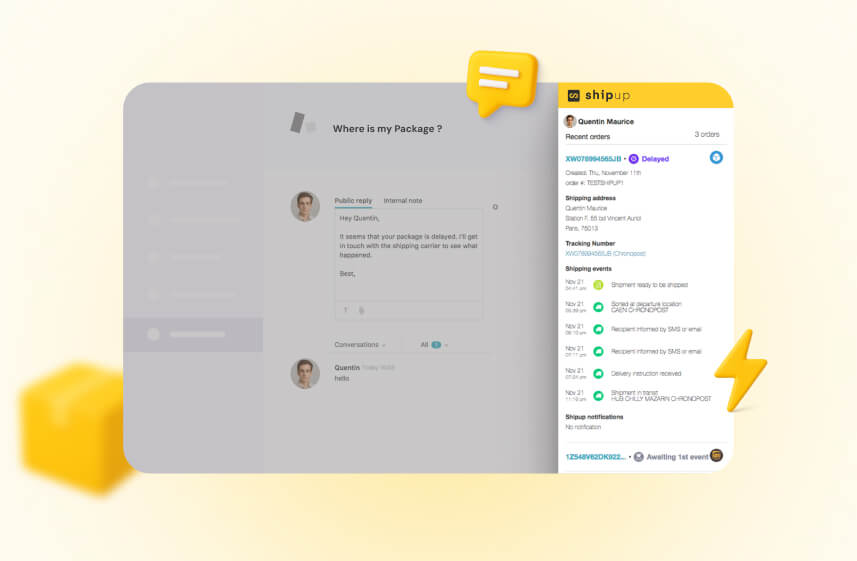 Shipup connects your delivery data directly into Zendesk. Each ticket shows the status, notifications, and incidents related to the order. Your support team has the complete context as soon as the ticket is opened and can resolve “Where is my package?” requests. ” three times faster, without leaving their interface.