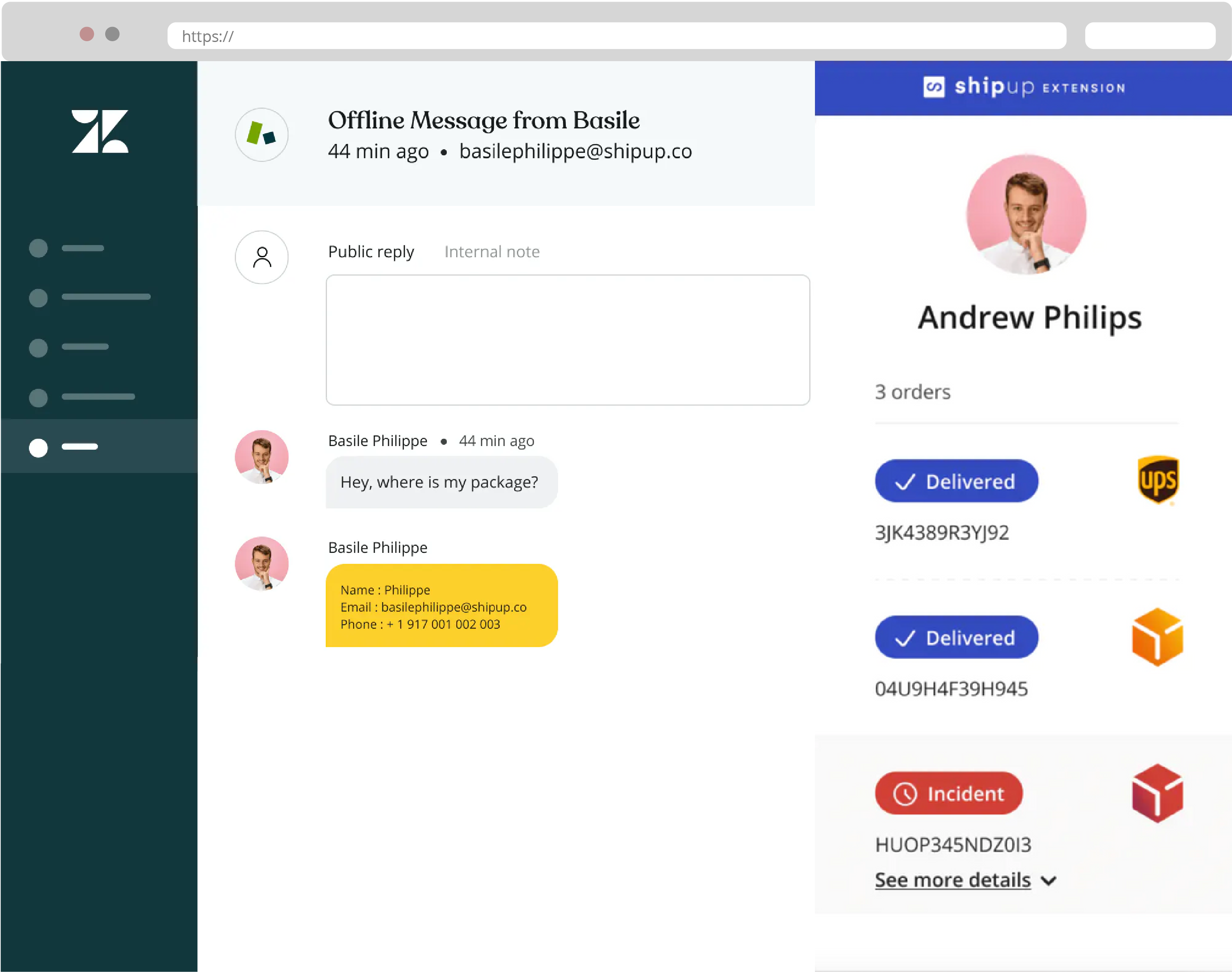 Shipup connecte les données liées à vos livraisons directement dans Zendesk. Chaque ticket affiche le statut, les notifications et les incidents liés à la commande. Votre équipe support dispose du contexte complet dès l’ouverture du ticket et peuvent résoudre les demandes « Où est mon colis ? » trois fois plus vite, sans quitter leur interface.
