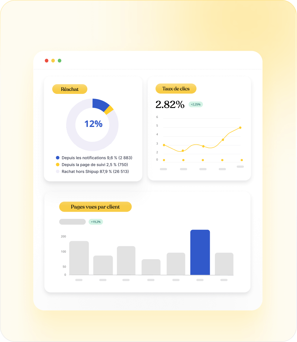 Oui. Shipup vous donne accès à des analytics détaillés : taux de clics sur les campagnes, visites par source (notifications, emails, etc.), performance des transporteurs, etc. Vous mesurez ainsi l’impact réel de votre page de suivi.