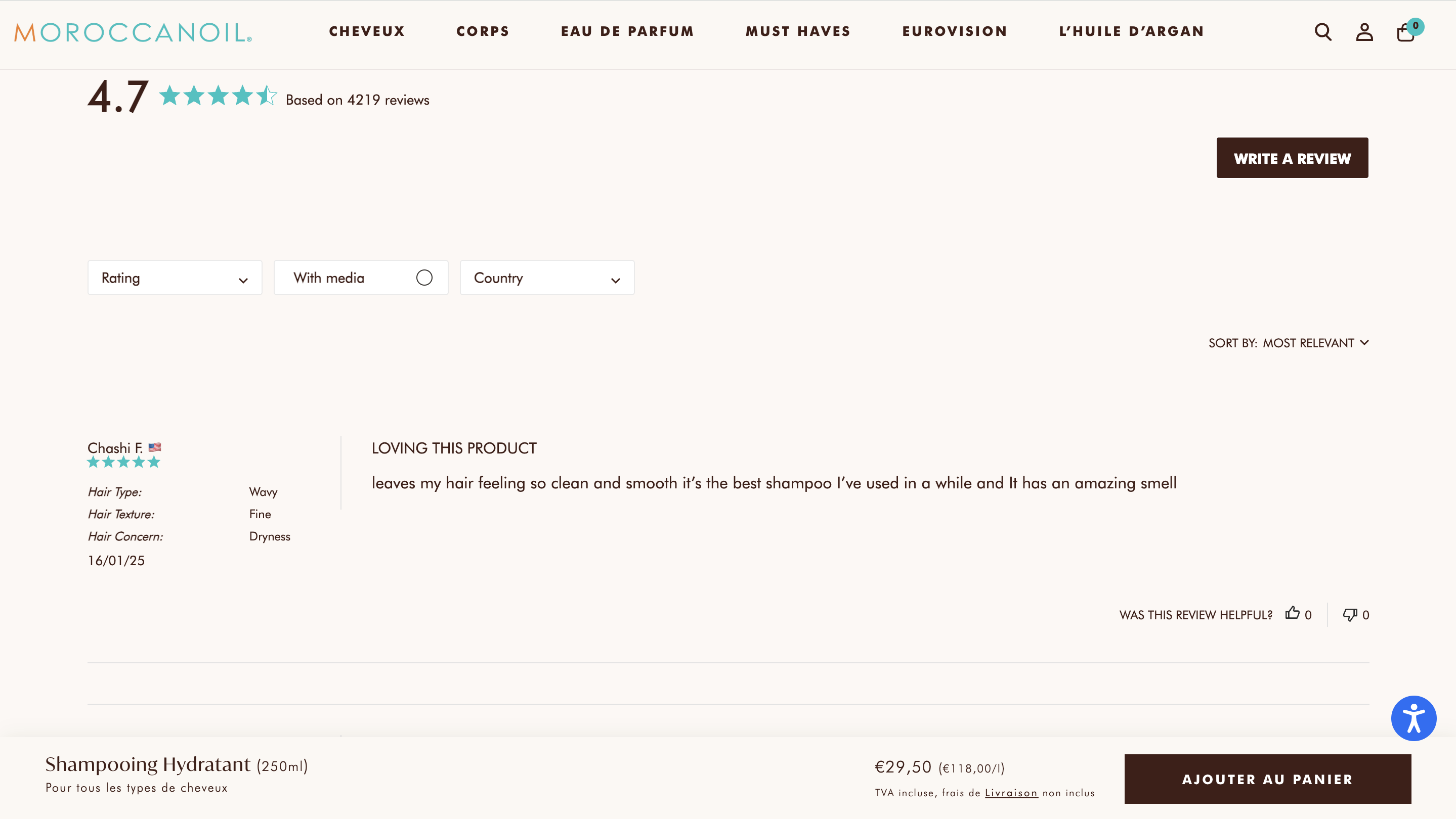 Yotpo permet au leader de la vente en ligne de produits capillaires Moroccanoil de recueillir des commentaires, des photos et des vidéos de haute qualité de la part de ses clients grâce à des invites intelligentes, des questions personnalisées et des demandes par SMS. Ce contenu généré par les utilisateurs est ensuite présenté sur les pages de produits via des widgets personnalisables, y compris des filtres par évaluation, pays et média.